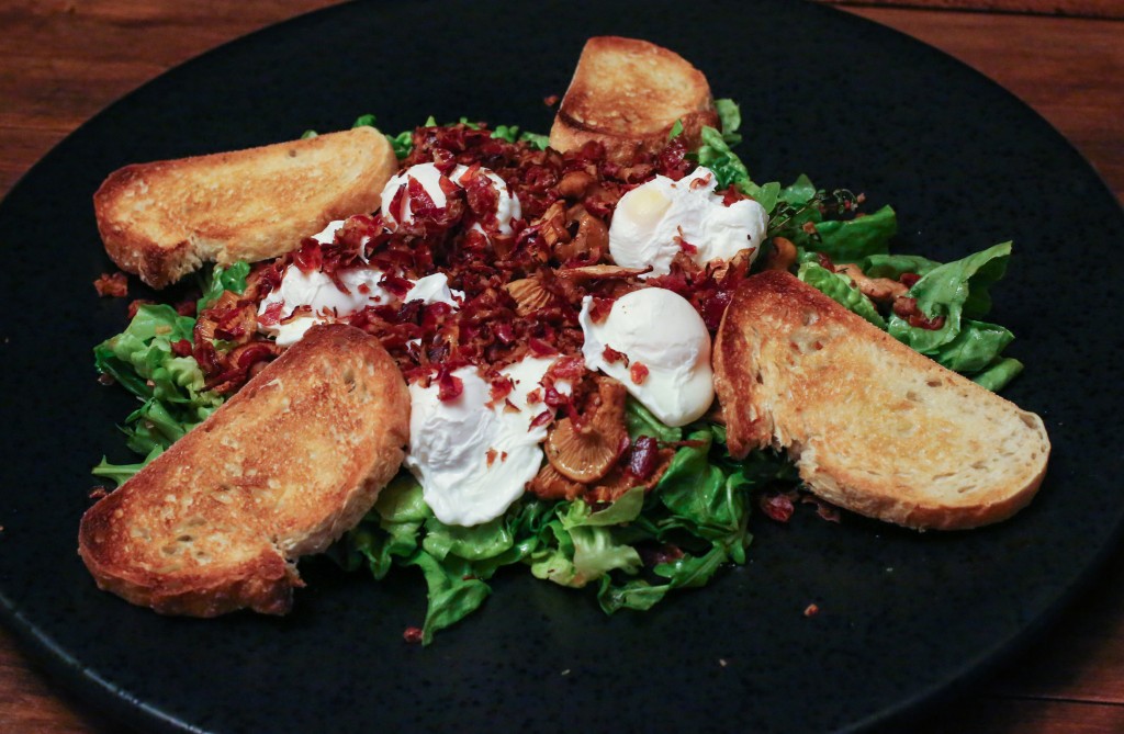 Warm Chanterelle Salad with Speck, Poached Eggs and Marsala Vinaigrette
